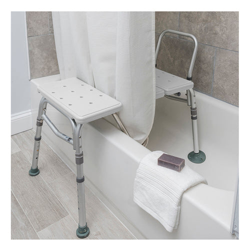 New U shape cut-out design enables the shower curtain liner to stay within the bath tub and avoiding water spillage outside onto the bathroom floor * Reversible to accommodate any bathroom * Tool-free assembly of back legs and arm * Height adjusts in « increments with unique 'Dual Column' extension legs * 400 lb weight capacity * A-frame construction provides stability * Durable blow-molded plastic bench and backrest * Pinch-free lever allows for push pins to be depressed without pinching fingers * Seat Width 28 * Seat Depth 16 Seat to Floor Height 16 Armrest Length 11.75 Armrest to Floor Height 27.25 Width Between Arms N/A- only one armrest Outside Legs Width 33.5 Width Clearance of Tub Wall 7 Height Adjustments 1/2 increments Warranty Limited Lifetime